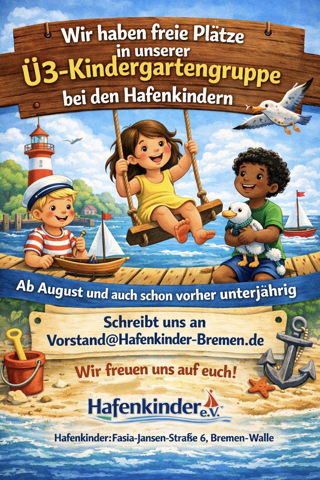 Im Jahr 2010 wurde der Elternverein „Hafenkinder“ gegründet. Das Besondere an einem Elternverein? Eltern beteiligen sich aktiv und halten Hand in Hand mit den Erziehern, das Konzept am Laufen. Wir haben mittlerweile zwei Betreuungsgruppen, die wie folgt unterteilt werden: